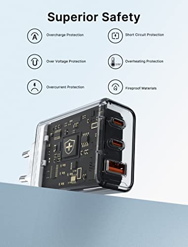 【Doppio USB-C da 20W】Due porte di ricarica USB-C da 20W sul caricabatterie USB-C multiporta ricaricano rapidamente due telefoni contemporaneamente. Può caricare l'iPhone 14 fino al 60% in soli 30 minuti. (Nota: Power Delivery è disponibile solo per iPhone 8 e modelli successivi). Un USB A da 18W
