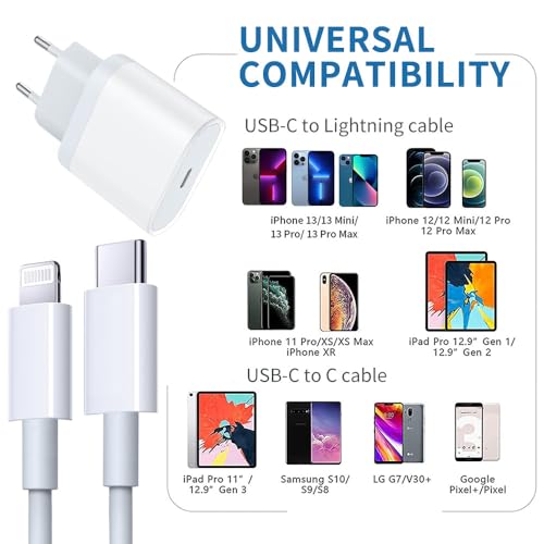 [Compatibilità forte]: il caricabatterie USB è compatibile con tutti i dispositivi che supportano Lightning.Compatibile con iPhone 13,13 Pro, 12,12 Pro, 12 Pro Max, 12 mini, SE 2020,11 Pro, 11 Pro Max, 11, X, XS, XS Max, XR, 8.8 Plus, AirPods Pro, AirPods Max, iPad 10.2 "(2021), iPad 10.2" (2020), iPad Pro 12.9", iPad Pro 10.5", iPad Air 3, iPad mini5, iPad 2019, iPad Pro 2017/2015. La carica rapida supporta solo iPhone 8 e la versione successiva
