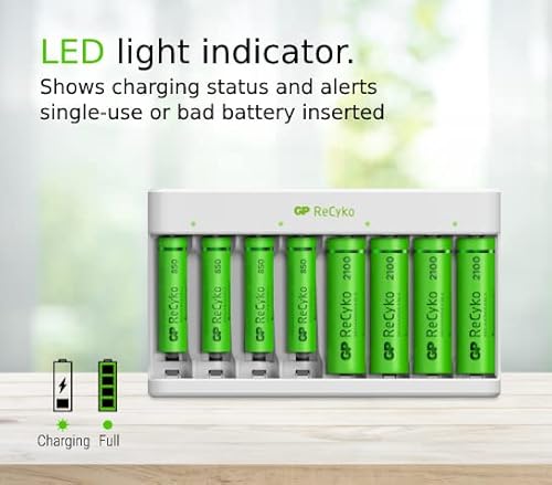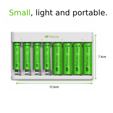 Caricabatterie a 8 Slot per Pile Ricaricabili AA e AAA NiMH | GP RECYKO | Include 4 Batterie Ricaricabili AA 2100 mAh e 4 Batterie Ricaricabili AAA 850 mAh - Caricatore USB