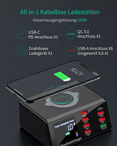 Caricabatterie wireless da 100 W con 6 porte USB (9,6 A), QC 3,0 USB (3 A), 18 W tipo C, 10 W, ricarica wireless ONLYWIN 8 porte USB con cavo da 1,5 m, nero