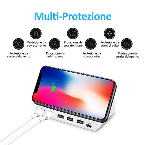 Caricabatterie USB C da 60 W, Caricabatterie Wireless da 10 W e stazioni di Ricarica Rapida USB a 5 Porte QC 3.0 con Porta di Tipo C 5V3A (828W)