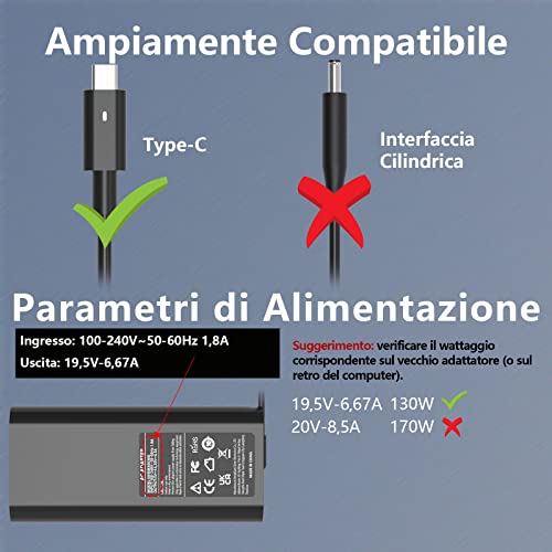 Caricatore 130W Alimentatore USB C Tipo Type C Adattatore per Dell XPS 15 17 2in1 9510 9575 9500 9700 Precision 5530 2in1 5550 5750 3550 3560 Latitude 7410 7310 7210 9410 9510 5420 5520 5510 C0041-E