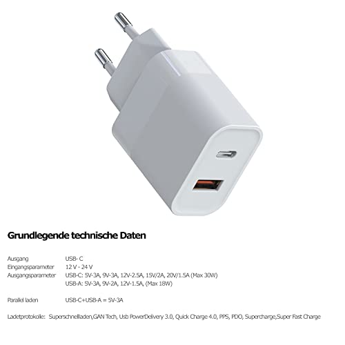 Potenza in uscita: porta USB A: 5V/3A= 15W, 9V/2A=18W, 12V/1,5A=18W Potenza massima in uscita: USB C: 5V/3A=15W, 9/3A=27W, 12V/2,5A=25W, 15V/2A, 20V/1.5A=30W Max contenuto della confezione: alimentatore USB C parziale + XXL USB Cavo di ricarica C
