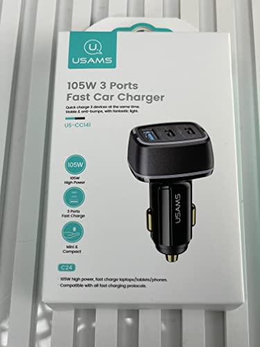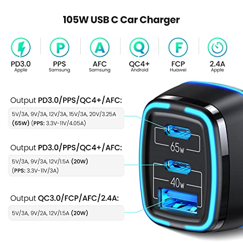 【Caricabatteria per auto a ricarica rapida da 105 W】: questo caricabatterie per auto USB-C super veloce è dotato di 3 porte per una ricarica rapida con potenza di uscita di 105 W e ingresso DC 12V-24V. Le porte PD65W e PD20W USB-C/PPS supportano PD3.0 e QC4.0 e altri protocolli, la tecnologia di ricarica rapida PPS e la porta USB-A da 20 W supportano il protocollo QC3.0.
