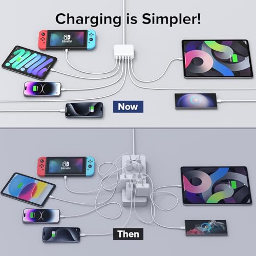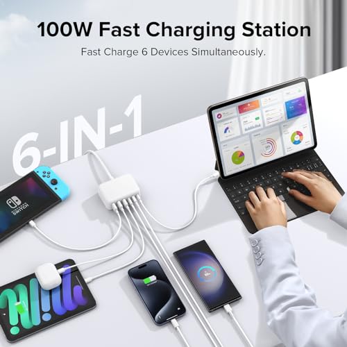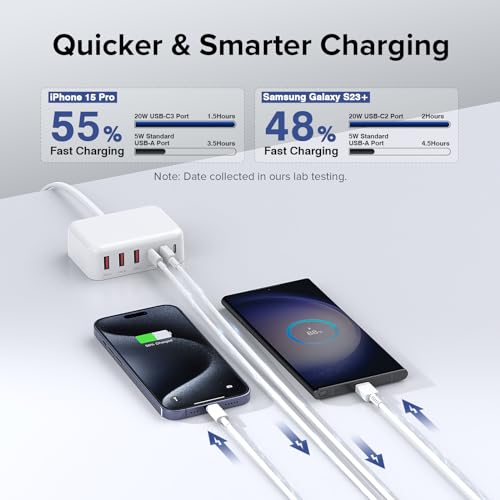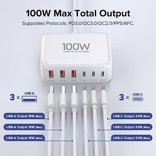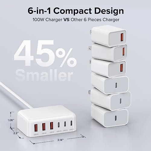 Caricatore rapido a 6 porte USB da 100 W: il caricatore USB C supporta le funzioni di ricarica rapida Quick Charge 3.0. L'adattatore di alimentazione con 3 porte USB-C (max 20 W) e 3 porte USB-A (massimo 15 W). Ci vogliono solo 30 minuti per caricare il vostro iPhone 14 al 60%. Caricatore USB tramite la ricarica rapida simultanea di 6 diversi dispositivi, tra cui orologi, cuffie, telefoni cellulari e ventilatori.