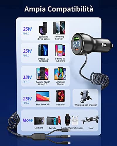Caricatore Auto USB C 2 Porte PD25W&QC 18W Carica Rapida Accendisigari USB con 1.2M 3 In 1 Cavo a Spirale di Tipo C Micro Phone Cavo Caricabatterie Auto Compatibile con iPhone 14 13 ,Samsung Galaxy