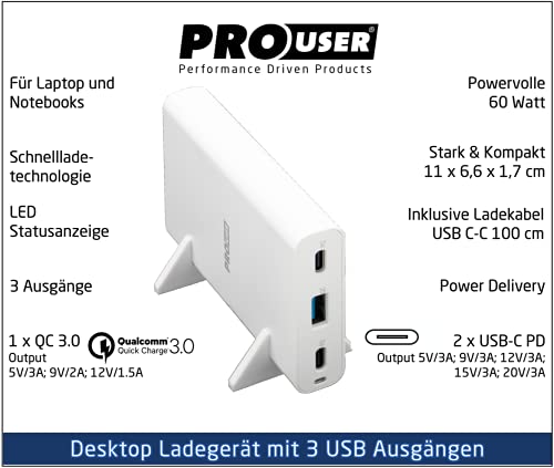 Pro User Caricatore da scrivania USB-C con 3 uscite USB, 2 porte USB C Power Delivery PD 60 W e 1 USB-A 18 W con Quick Charge, notebook e tablet - MacBook Pro 13", MacBook Air, Tablet UVM.