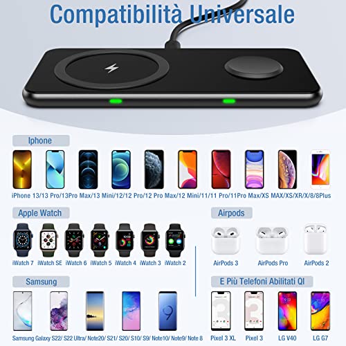 2 in 1 Caricatore Wireless, Qi Certificato Ricarica wireless Compatibile con iPhone 14/14 Pro/13/13 Pro/12/12 Pro/11/X/8, Samsung S22/S21/ S20/ Note 20, Airpods 3/2/Pro, iWatch 8/7/6/SE /5/4/ 3/2