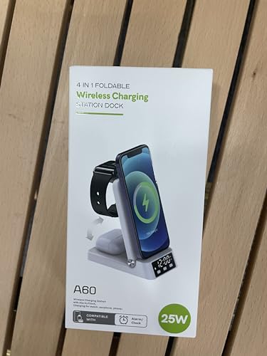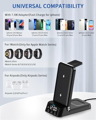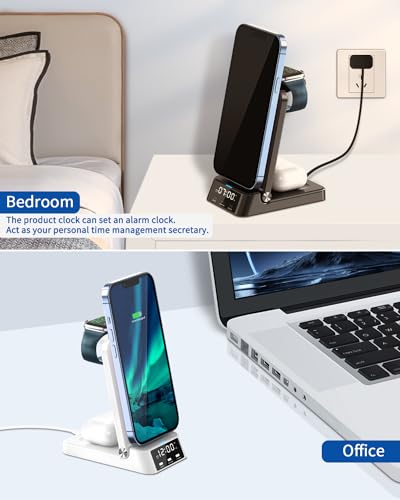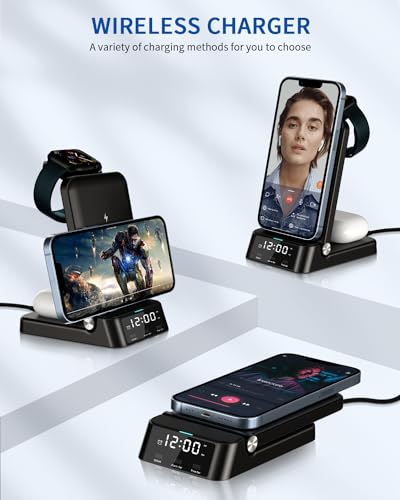 Caricatore Wireless con Sveglia, Stazione di Ricarica Induttiva Pieghevole 4 in 1,Wireless Charger compatibile con iPhone serie 15/14/12/13/11/Pro/Pro Max/XR/XS/X/8, può solo iWatch e Airpods(Nero)