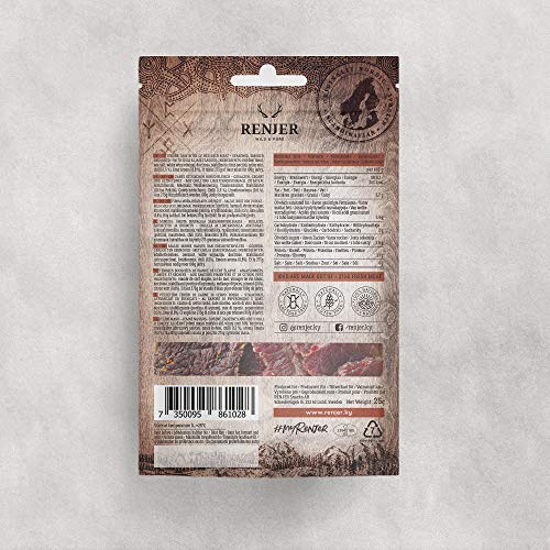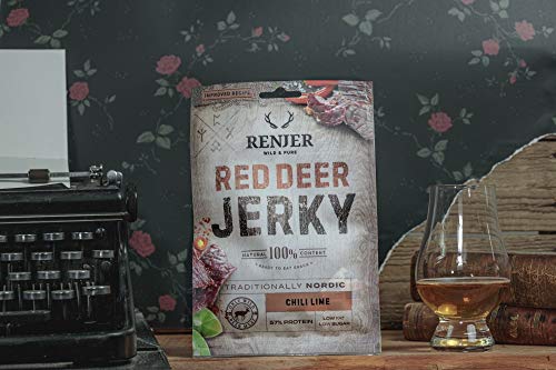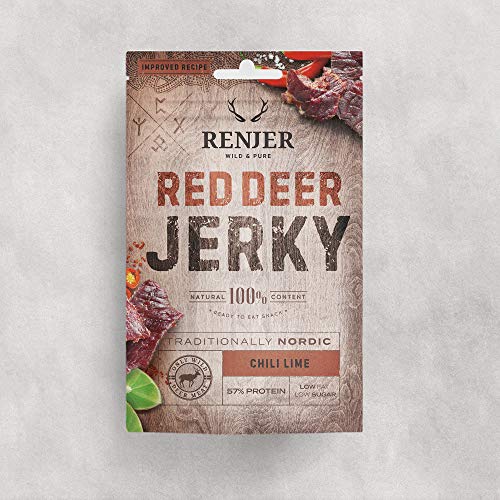 Carne Secca di Cervo Rosso Gusto Chili Lime | RENJER Red Deer Jerky | Snack Proteico a Basso Contenuto di Carboidrati e Grassi | Senza Glutine | Confezione Risparmio (12 x 25g) |