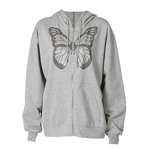 Carolilly Felpa con Cappuccio da Donna Manica Lunga Stampa Farfalla con Cerniera Felpa con Cappuccio Ragazza Grigio Casual Oversize Cappotto Donna Corto Sportivo (Grigio, S)