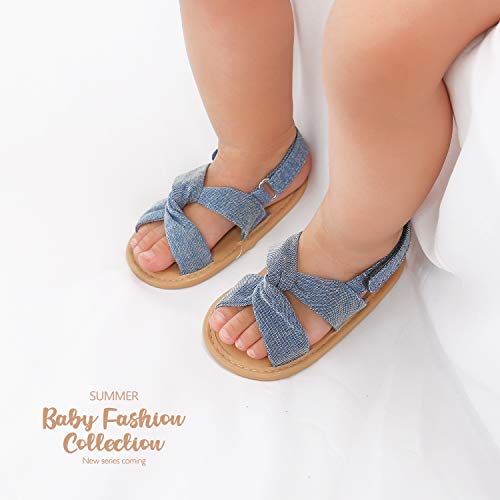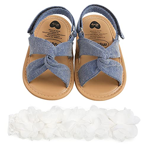 Carolilly Sandali Neonata Scarpe Primi Passi Battesimo Bimba Infantile Elegante Scarpine Neonato Principessa in Pizzo Scarpe AntiScivolo + Fascia per Neonata (denim blu, 12-18 mesi)