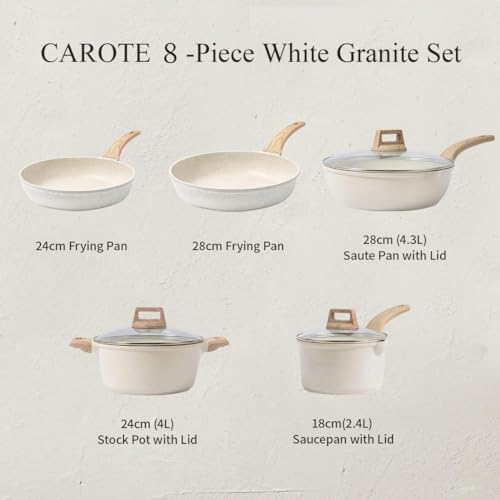 CAROTE Essential Batteria di Pentole 8 Pezzi,Padella 24/28cm, Casseruola 18/24cm/1.7L/4L con Coperchi, Wok 28cm, Rivestimento Antiaderenti Per tutti i piani cottura anche ad induzione