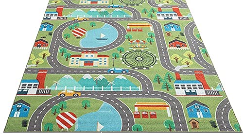 The carpet Happy Life - Tappeto da gioco per bambini, con immagine di una strada che attraversa una città e automobili, sfondo verde, 240 x 340 cm.