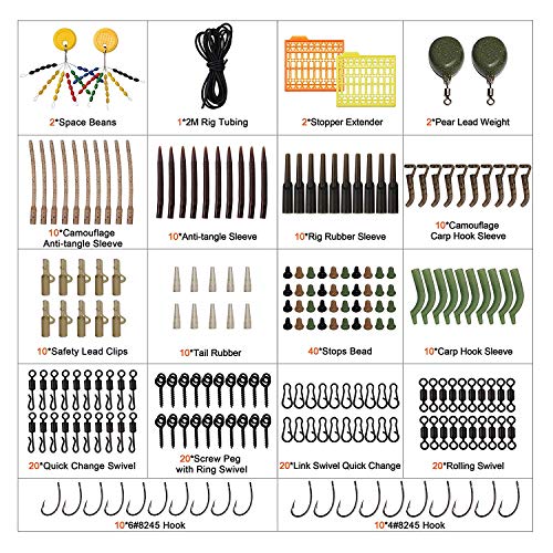 Il set di accessori per la pesca include 217 accessori necessari per la pesca alla carpa: perline spaziali, tubi per rig, estensore per stopper, peso in piombo per pera, maniche anti-groviglio, polsini in gomma, maniche per ganci per carpe, clip di sicurezza per piombo.