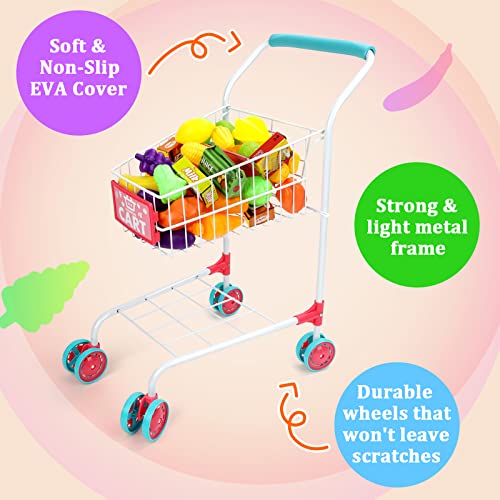 DeAO 47 PCS Carrelli per la Spesa in Metallo per Bambini con Cibo da Gioco Frutta,Carrelli per la Spesa per Bambini Playset Set di Giocattoli da Cucina, Bambini Carrello Piccoli Supermercati (White)