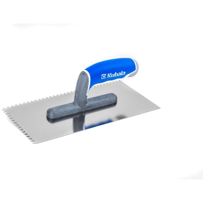 Dati tecnici: Dimensioni: 130x270mm. Dente: 12x12. Descrizione: Cazzuola per la stesura di malte adesive. Maniglia morbida 3K ergonomica, bilanciata e profilata, su base in poliammide addizionata di fibra di vetro, resistente agli acidi, spessore 0,7 mm.