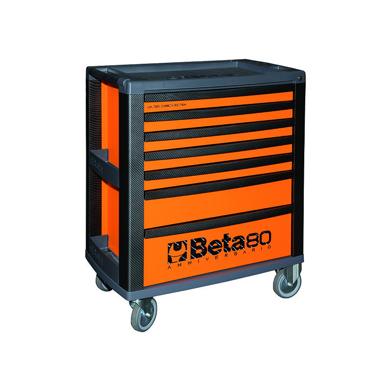 Cassettiera mobile con sette cassetti, Beta C39, robusta struttura in alluminio, carrello top gamma per materiali e design! Carrello Beta C39 7 Cassetti Alluminio Carbon Look Limited Edition 80° Anniversario. Caratteristiche tecniche della cassettiera BETA C39 Carbon limited Sette cassetti da 588x367 mm, montati su guide telescopiche a sfera: N°5 cassetti altezza 70 mm N°1 cassetto altezza 140 mm. N°1 cassetto altezza 210 mm Piano dei cassetti protetto da tappetini di gomma espansa. Quattro ruote Ø 125 mm: 2 fisse e 2 girevoli (una con freno). Serratura di sicurezza centralizzata frontale. Sistema di apertura posizionato su tutta la lunghezza del cassetto. Capacità di carico statico: 1200 kg. Piano di lavoro termoplastico. Portaflaconi laterali e posteriori integrati. Portacarta integrato. Struttura portante in alluminio Peso: 59 kg