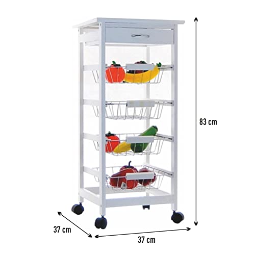 CARRELLO SALVASPAZIO 37 x 37 H. 82 cm: Il carrello cucina salvaspazio con struttura in legno offre ampio spazio per organizzare utensili e altri oggetti da cucina. I quattro cestelli in acciaio consentono di riporre in modo ordinato frutta, verdura ed altri alimenti mantenendoli freschi. Il cassetto e il top in ceramica forniscono spazio aggiuntivo e un piano di lavoro e di appoggio.