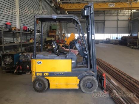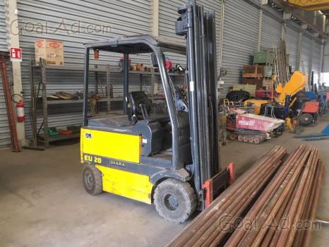 Carrello elevatore elettrico Fiat modello Fase EU20, con traslatore, altezza di sollevamento max 5,8 mt. Colonna triplex, idrostatico, alzata libera 200 cm, forche da 120 cm, batteria da 96 volts, completo di caricabatterie, anno 2000.