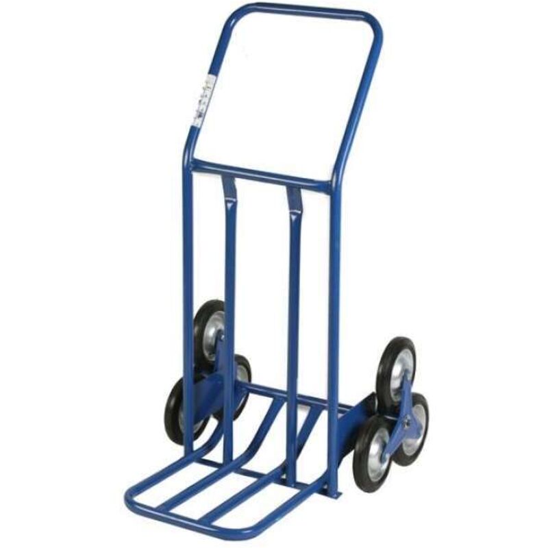 Carrello in acciaio Con manico singolo, telaio a sbalzo e supporto rotante a 6 ruote di tipo ''secure step'' Il supporto non tocca il gradino, anche se con pedana aggettante Dimensioni: cm 60 x 60-80 x h. 118 Portata massima: 120 kg