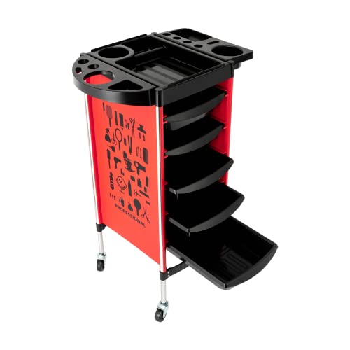 Carrello da parrucchiere, con 5 cassetti estraibili e ruote, pieghevole, per parrucchiere, colore rosso