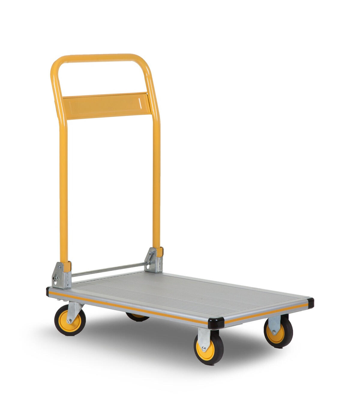 Carrello piattaforma in alluminio verniciato giallo, dimensioni del pianale 74x47 cm, 4 ruote in plastica piene, portata massima di carico 150 Kg. Ideale per magazzini commerciali, negozi al dettaglio e corrieri.. Dotato di maniglione che si apre in pochi secondi, compatto per un comodo trasporto. Dotato di maniglione rigido in acciaio per manovre sicure dei carichi, che si apre in pochi secondi compatto per un comodo trasporto. Ampio pianale in alluminio cm 74x48. Design robusto realizzato in alluminio leggero e resistente.