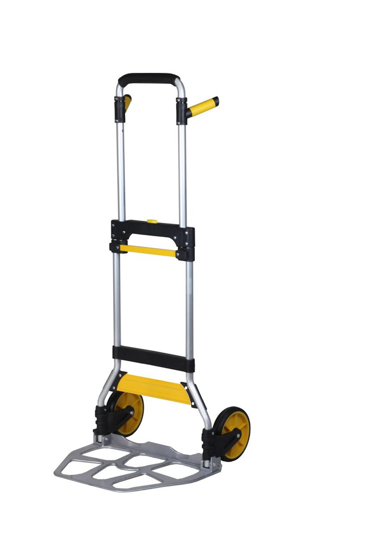 Carrello pieghevole in alluminio grigio, 2 ruote in plastica piena, portata massima di carico120 kg. Adatto al trasporto di casse, pacchi, oggetti fino a 120 kg. Ultra-compatto. E' facile da trasportare e riporre. Ruote antiforatura diam. 175. Maniglie ergonomiche richiudibili