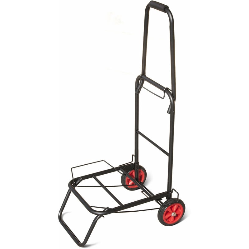 Carrello Portapacchi Carrello Pieghevole Portapacchi in Acciaio con Ruote in Gomma Carrello compreso di cinghia ferma pacchi struttura in acciaio verniciato a polvere nero tubolari telaio Ø mm 19 X 0.7 altezza totale da terra cm 97.5 piano di carico cm 38 X 33.5 (cm 45 con alette laterali aperte) altezza piano di carico da terra cm 16 ruote in gomma Ø cm 14 X 3.5 Dimenisoni aperto cm 42 X 49 X h97 Dimensioni chiuso cm 62 X 33.5 peso kg 2.75
