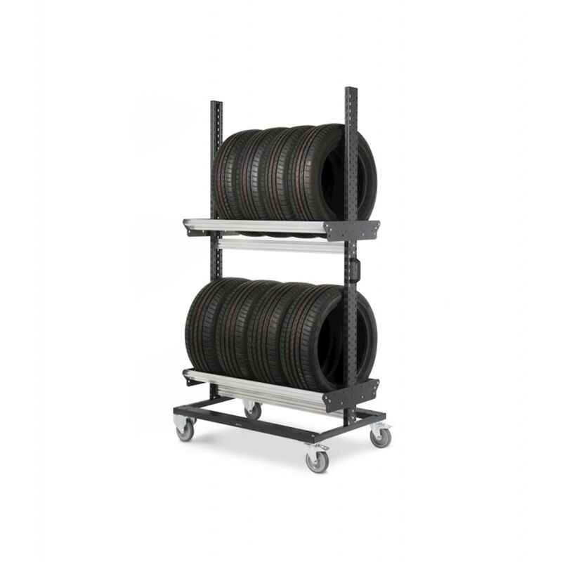 Il carrello porta pneumatici Bin Cart presenta due ripiani su cui è possibile appoggiare e trasportare in tutta sicurezza gli pneumatici. I profili in alluminio installati alla base e nella parte centrale della struttura rendono il carrello più stabile e robusto. Può ospitare un massimo di due treni di gomme e può essere facilmente movimentato all'interno dell'officina grazie alla maniglia posta sui montati e alle quattro ruote in gomma antitraccia sintetica. Ogni confezione contiene: 1 Carrello smontato senza ruote 2 Coppia piastre di supporto per profilo in alluminio 6 Profilo in alluminio per Picking Box 2 Ruote fisse gomma antitraccia sintetica Ø 125 mm 2 Ruote girevoli con freno gomma antitraccia sintetica Ø 125 mm