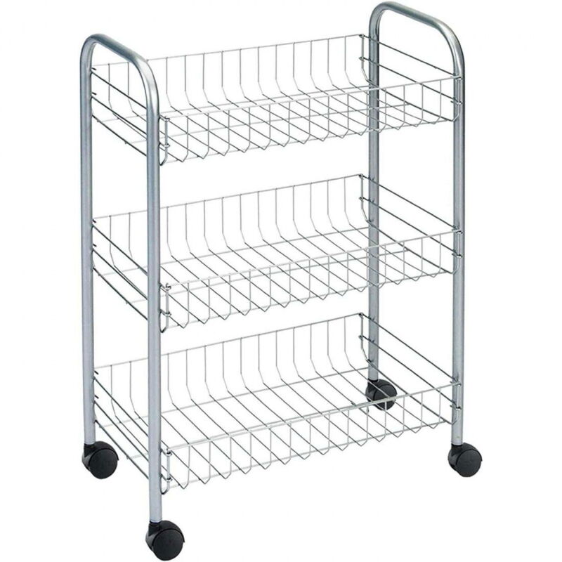 Carrello portaoggetti in acciaio inox con quattro ruote e tre cestelli. Può essere utilizzato in bagni e cucine ma anche camere da letto e soggiorni. - Carrello portaoggetti in acciaio inox - Quattro ruote e tre cesti Specifiche: Colore: Nero, bianco e argento Materiale: acciaio inossidabile Dimensioni: 60 x 45 x 26 cm