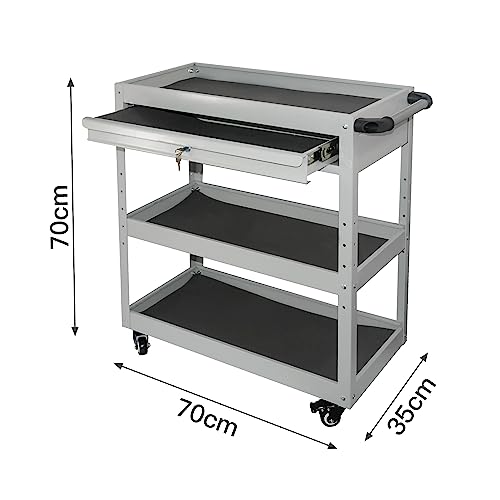 Grande capacità di archiviazione: il nostro carrello degli attrezzi ha un ampio spazio di archiviazione con 3 strati che contengono tappetini antiscivolo. La dimensione del carrello da officina è di 70 x 35 x 70 cm. Diversi strumenti possono essere posizionati su diversi strati del carrello per migliorare l'efficienza del lavoro.