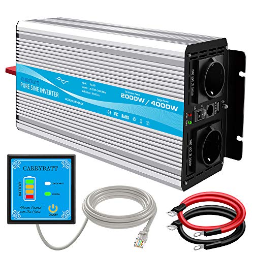 CARRYBATT 2000W Inverter di Potenza 24V DC a 220V 230V Power Trasformatore Convertitore da con Telecomando con 2 Presa AC & 1 Porte USB 2.1A per auto, roulotte, barca, campeggio, viaggi