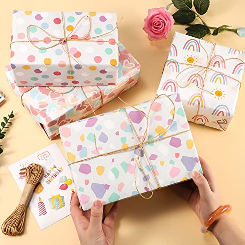 Carta Regalo Bambini, 70 x 50cm Carta Regalo Compleanno Carta da Pacchi Colorata con Corda Adesivi di Compleanno Nastro Biadesivo per Compleanno dei Natale Festa Cerimonia di Laurea (4 Fogli)