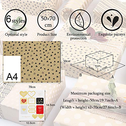 DIMENSIONE: Kraft Carta Da Pacchi Impostata Ogni foglio è 19.6inch (50cm) di larghezza e 27.5inch (70cm) di lunghezza, totale 6 fogli di carta da regalo.