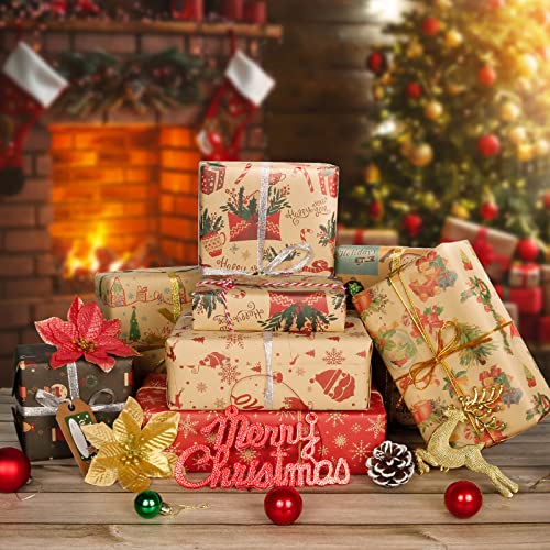 Carta da Regalo Natalizia, Taumie 8 Fogli Carta da Regalo Natalizia Kraft, 70x50cm Riciclata Christmas Wrapping Paper, Nastri, Corde Elastiche, Adesivi per Festival Regali Bambini Festa di Natale