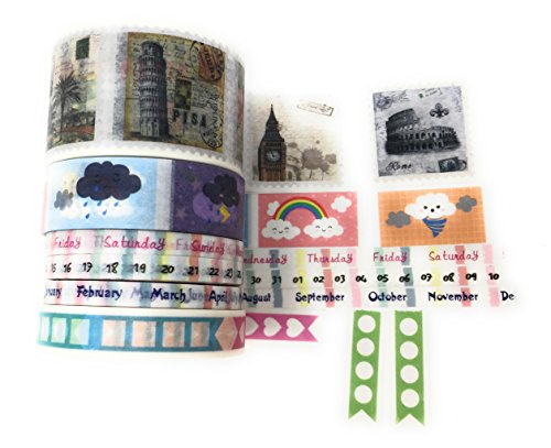 6 rotoli - 3 x carta Washi perforata da ritagliare, 3 x nastri di carta Washi per agenda (con i giorni della settimana/elenco di numeri e mesi), 5 mm di larghezza x 10 m di lunghezza.