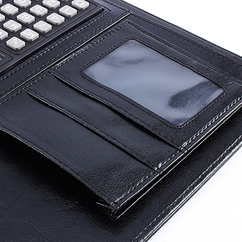 Cartelletta portadocumenti da lavoro in pelle sintetica, in formato A4, con supporto per la scrittura, calcolatrice e scomparti per penne, tessere, documenti, ecc., colore nero