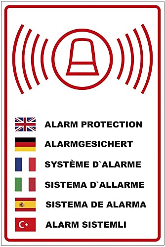 NEW CARTELLO SEGNALETICO - SISTEMA D'ALLARME in più lingue - Adesivo Extra Resistente, Pannello in Forex, Pannello In Alluminio (ADESIVO 20X31 CM)