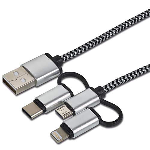 Cartrend 10407 Cavo Dati e Ricarica 3 in 1 Lightning, da Micro Type-C a USB, Estremamente Resistente Grazie al Rivestimento in Nylon per Una Maggiore Durata, Nero