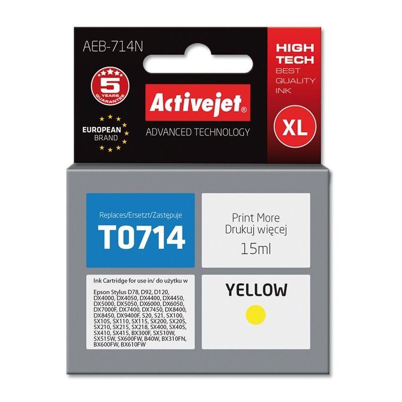 Caratteristiche Descrizione del prodotto:Cartuccia d'inchiostro Activejet Tipo di inchiostro a colori:Inchiostro a base di pigmenti Quantità per confezione:1 pezzo/i Colori di stampa:Giallo Sostituzione per:Epson Codice OEM:Epson T0714, T0894, T1004 < li >Tipo: Compatibile Compatibilità marchio: Epson Tecnologia di stampa: Stampa a getto d'inchiostro Numero di cartucce d'inchiostro a colori: 1 Inchiostro a colori volume: 15 ml Tipo di inchiostro: inchiostro a base di pigmenti Capacità della cartuccia: resa elevata (XL) Resa in pagine con inchiostro a colori: 480 pagine Peso e peso dimensioni Tipo imballo:Scatola Altre caratteristiche < li>Descrizione del prodotto:Cartuccia d'inchiostro Activejet Tipi di inchiostro compatibili, materiali di consumo:T0714;