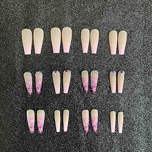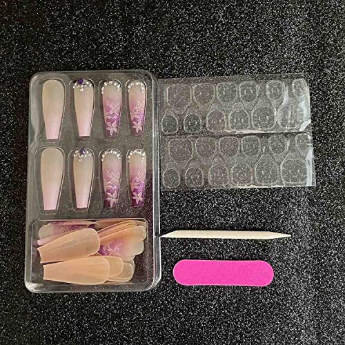 Carufin 24Pcs Gradiente Fiore Viola Unghie Finte Bara Lunga di Cristallo Acrilico Unghie Finte Premere sulle Unghie Balletto Unghie Finte per Le Donne Ragazze (Fiori)