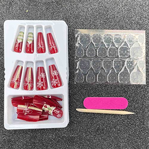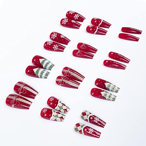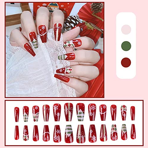 Carufin 24 Pz Neve Albero di Natale Checker Rosa Linea Francese Unghie False Acrilico Nail Pressa su Unghie Balletto Unghie False per Donne Ragazze (E)