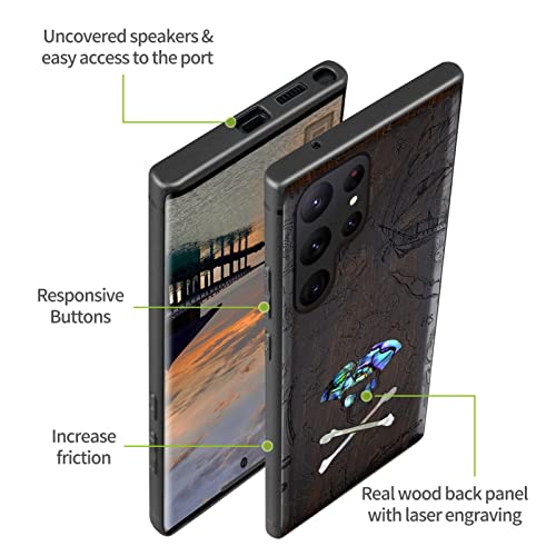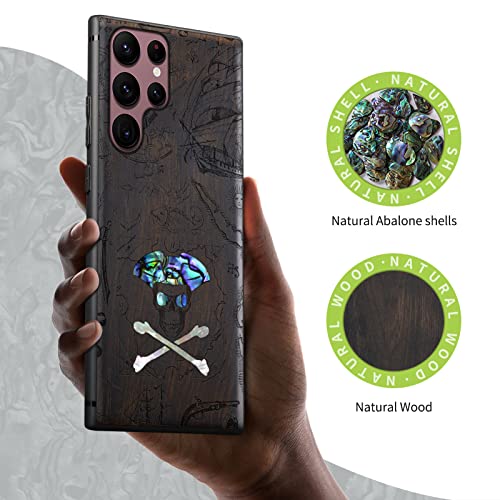 Carveit Cover per Galaxy S22 Ultra Custodia [Incisione in legno e intarsio di cozze] Lusso e personalità Protezione Compatibile con Samsung S22 Ultra Case (Legno nero-Skull pirata)