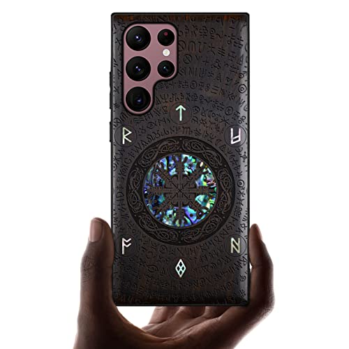 Carveit Cover per Galaxy S22 Ultra Custodia [Incisione in Legno e intarsio di cozze] Lusso e personalità Protezione Compatibile con Samsung S22 Ultra Case (Legno Nero-Das Vegvisir des Wikinger)