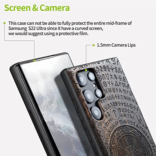 Carveit Custodia per Galaxy S22 Ultra Cover [Retro in Legno e Telaio in TPU] Shock in Silicone Protezione Compatibile con Samsung S22 Ultra Custodia (Legno nero-The Vegvissir of Viking)