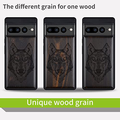 Carveit Custodia per Google Pixel 7 Pro Cover [Retro in Legno e Telaio in TPU] Slim Fit Anti-Shock in Silicone Protezione Compatibile con Pixel 7 Pro Case (Legno nero-Testa di lupo)
