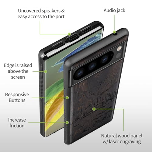 Carveit Custodia in Legno per Google Pixel 8 Pro Cover, Paraurti Robusto TPU Case, Antiurto Protezione Compatibile con Pixel 8 Pro Custodia (Legno nero-laghi e montagne)