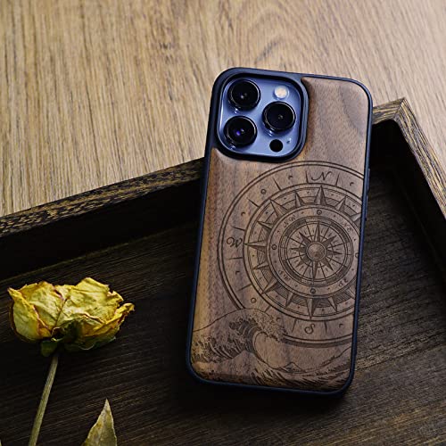 Carveit Custodia In Legno Per iPhone 13 Pro Cover avec magnetico Custodia [Noce Legno] [Paraurti Robusto TPU] Ricarica Compatibile con 13 Pro MagSafe Custodia (La bussola grandi onde)