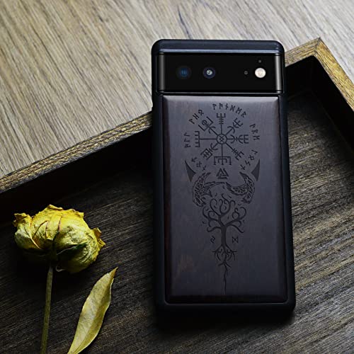Carveit Custodia in Legno per Pixel6 Paraurti Robusto TPU[Legno nero] Antiurto con Protezione Compatibile con Google Pixel6 Cover (Bussola vichinga)